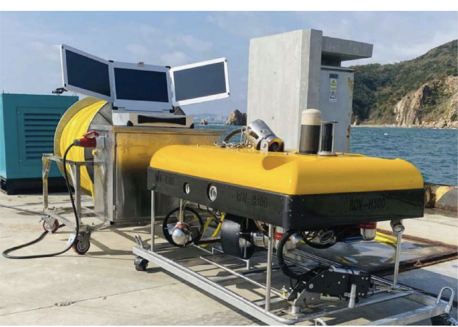 WM ROV-300H underwater robot system includes one underwater robot vehicle, one control Termi- nal and one set of zero buoyancy optical composite cable electric winches.